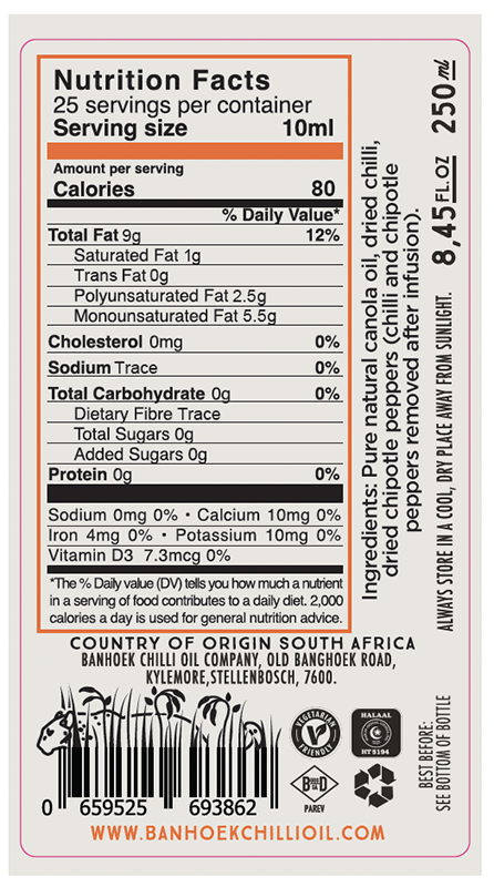Banhoek Chilli Oil Chipotle - The Original, infused with Mexican chipotle peppers. Chipotle is the Mexican word for ripe, red, smoked jalapeño peppers. It is a great way to enhance any cheese-based dish, grilled fish and meat, beans, and rice.