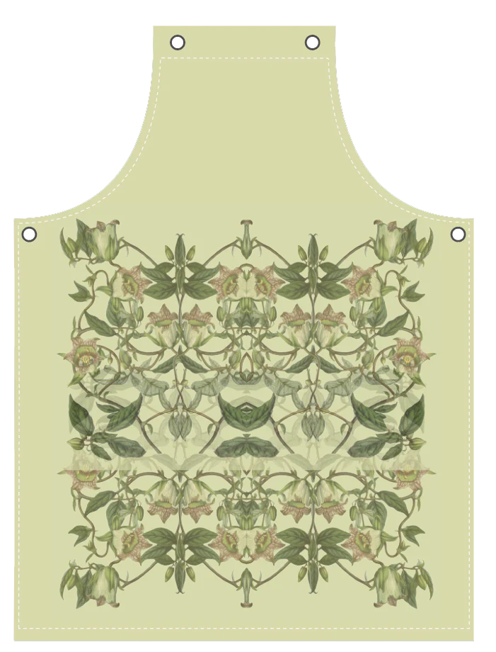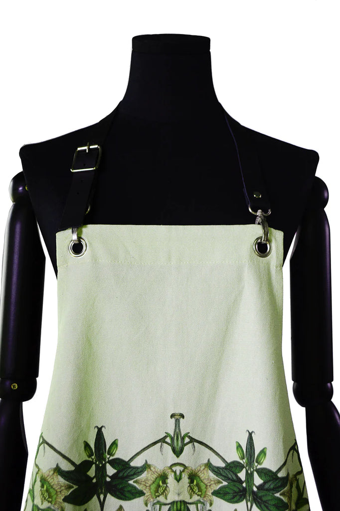 100% cotton Twill Apron with Hendrik Willem's unique botanical floral print in Mint, with cotton twill straps trimmed with leather and silver hardware.