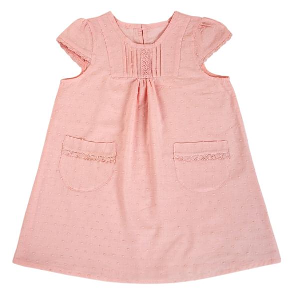 Cotton dress with lace trimmed pockets, and pleats and lace trim on chest.