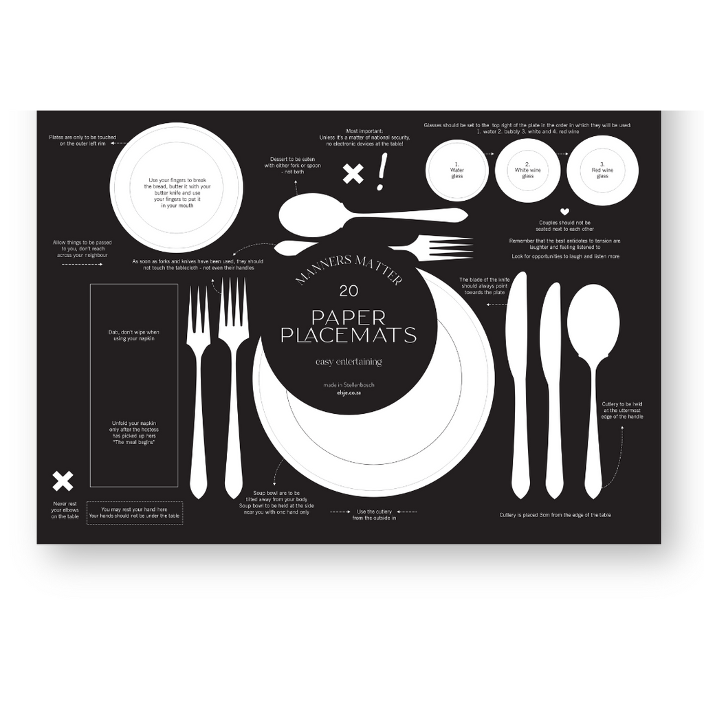 Add elegance and education to your table with the Manners Matter placemat to match any occasion. Each pack contains 20 identical A3 placemats (approx. 420 x 297mm), crafted from 100% recycled paper with vibrant full-color prints. These versatile placemats also double as charming gift wrap for small presents. Perfect for teaching table etiquette or as a thoughtful hostess gift. Order your favorite design today and make your dining experience both beautiful and meaningful!