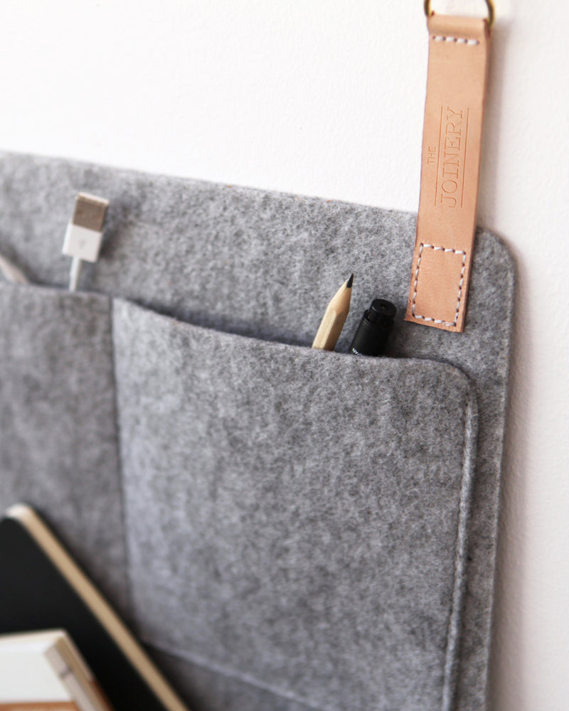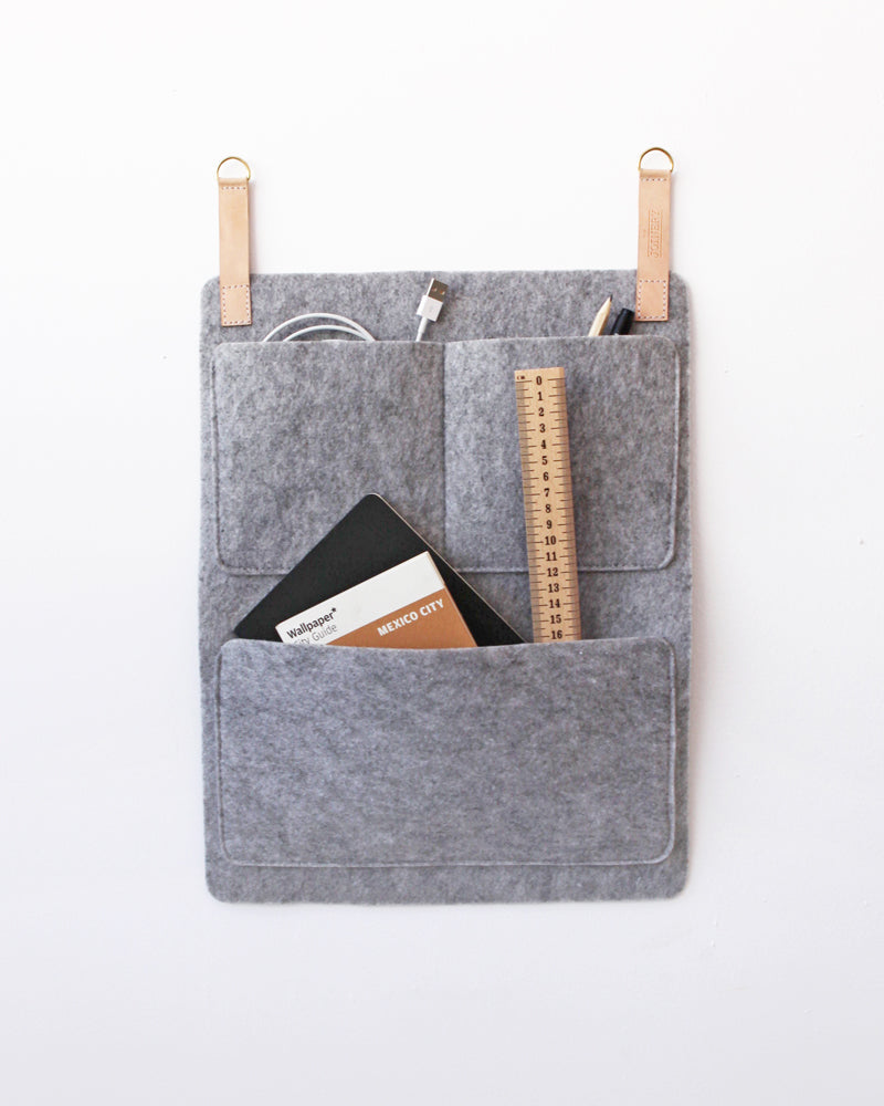The Joinery's Hanging Storage system is made from recycled plastic bottles and is the perfect place to store those important items you need on hand. Made with our grey Future Felt™ and natural leather accents.