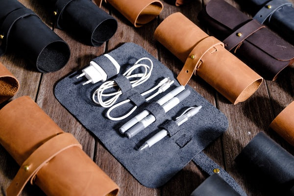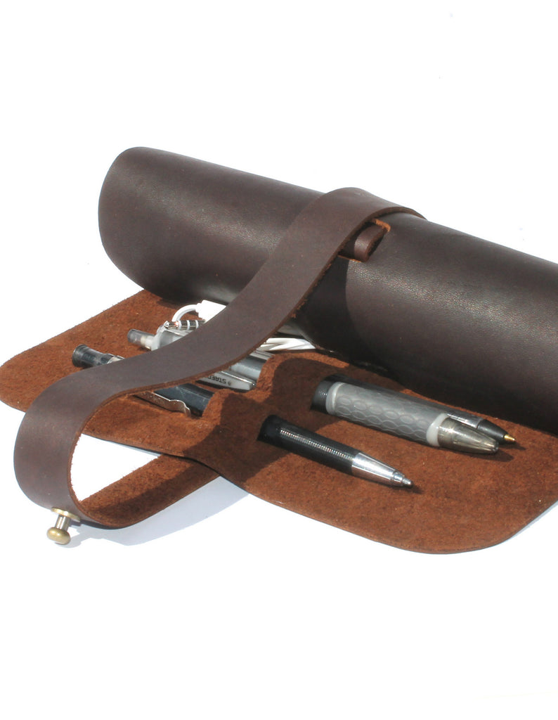Chocolate Genuine Leather Cable and Pen Roll-Up