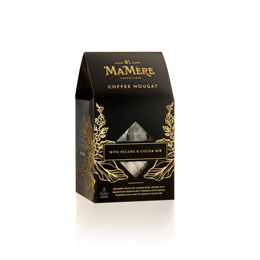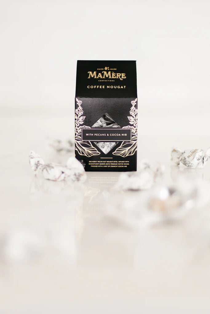 Individually wrapped pieces of decadent Pecan nougat bites, infused with Magnificent Barista Boys premium coffee beans, finished with a hint of crunchy cocoa nib.