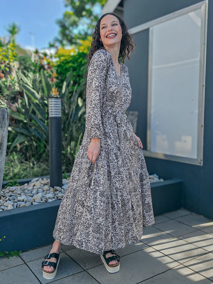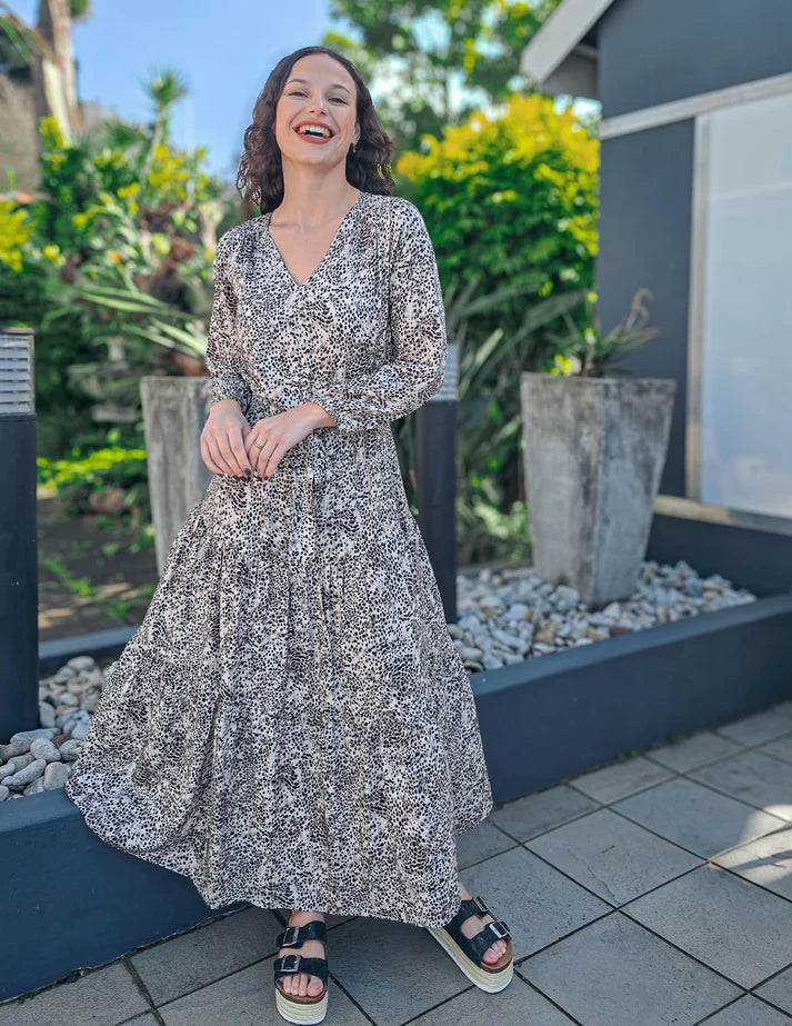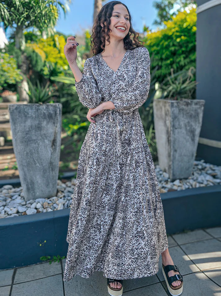 Effortlessly elegant, the Brae Dress is a timeless addition to your wardrobe. Designed with soft, flowing tiers that move beautifully with every step, this full-length 100% Viscose maxi dress features a flattering V-neckline, long sleeves, and a self-tie belt to define the waist. The long sleeves provide graceful coverage, with a relaxed fit that adds a touch of elegance without feeling. Its softly tiered skirt creates gentle volume and movement, adding a sense of lightness and femininity to the silhouette. A detachable self-tie belt cinches the waist, allowing you to wear it relaxed or defined, depending on your mood or occasion. restrictive.