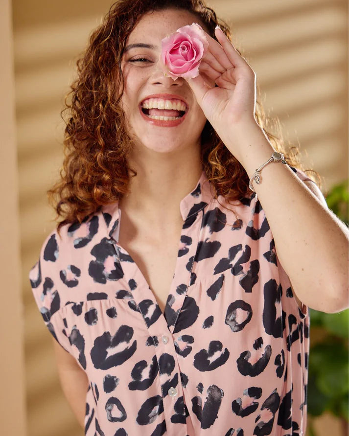 Coco - Pink Oversize leopard: Button-up classic tiered dress with detachable belt