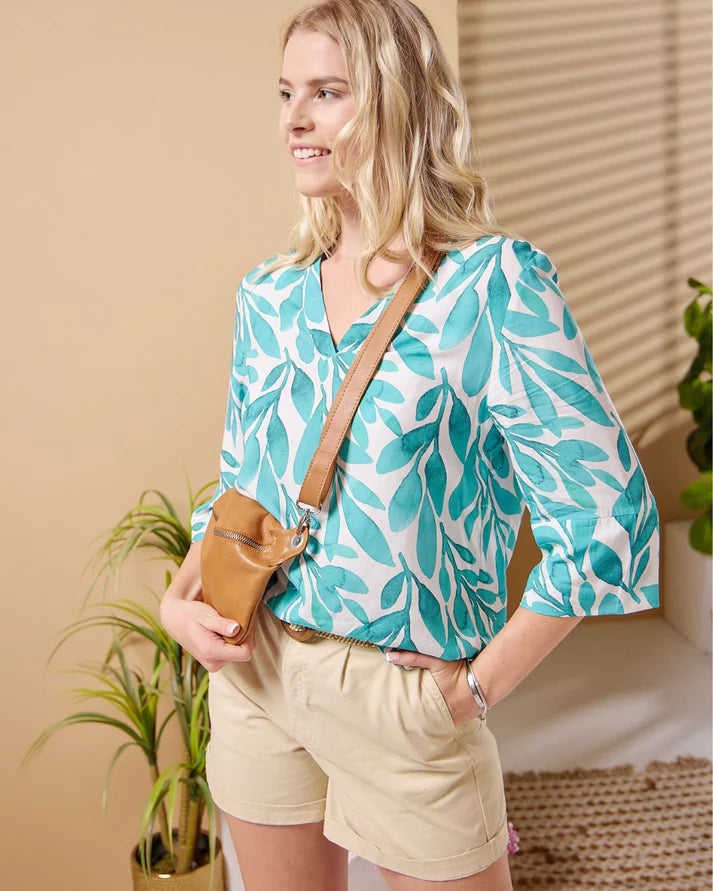 Stay cool and stylish in the River Teal Foliage. Locally made from a breathable and soft Viscose fabric, the blouse is loose-fitting for effortless comfort and features an elegant v-neckline. The soft flared 3/4 sleeves are finished off with a cuff. The top has a curved hem on the front and straight hem on the back.