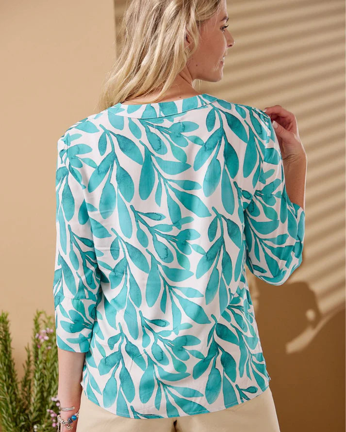 River - Teal Foliage: Classic V-neck top with 3/4 sleeves
