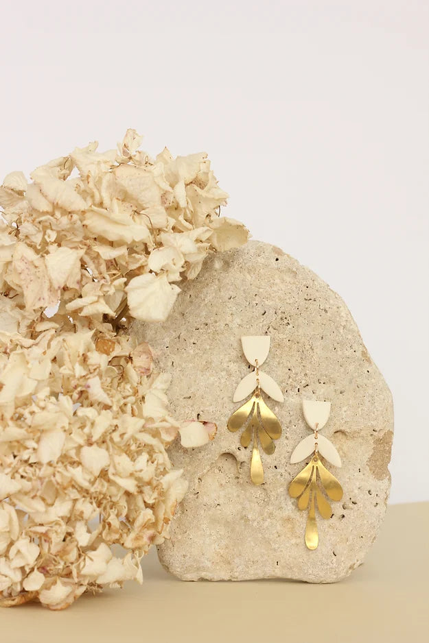 These lightweight, handmade, polymer clay earrings are unique and will make a statement with every outfit. Sand coloured statement earring with brass components.