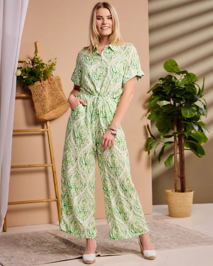 Luna - Green Vintage Damaske: Collared wide leg jumpsuit with Short sleeves